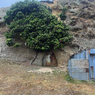It's a nice spot under the trees. Rodent traps curate a thriving ecosystem, a DIY kitchen provides a sea-to-table dining experience and there's a water source where it seeps down the rock face.