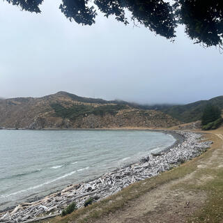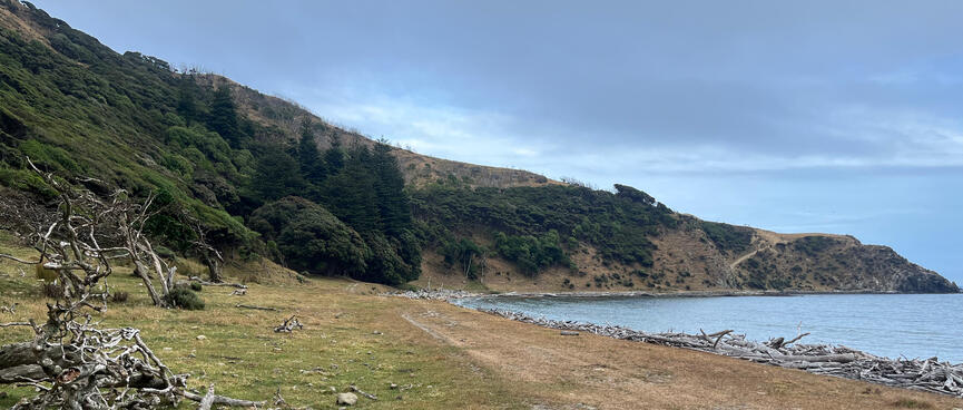 The hillsides are steep and I can't readily see a way down, but I know that I'm approaching another bay - Oteranga, where the Cook Strait (power) cable comes in - so the slope should start steep then fade out, if it's like Te Ikaamaru Bay.