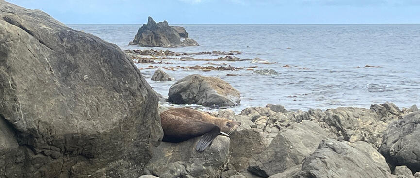 As I exit the far end of Ohau Bay, I see two men in a small fishing vessel. They seem to be hunting for something in the harbour before moving towards the far beach. I do hope they're not looking for their lost sandal.