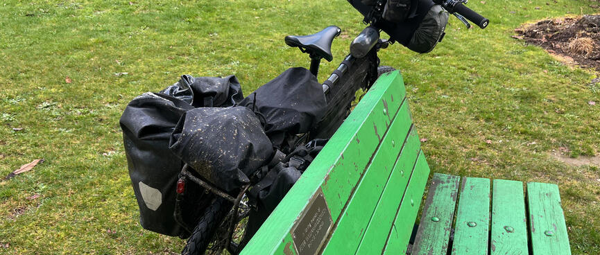 The DIY silicon treatment is peeling off of the panniers, especially where I've jammed them under the metal stiles that keep dirt bikes off the trails.
